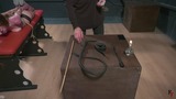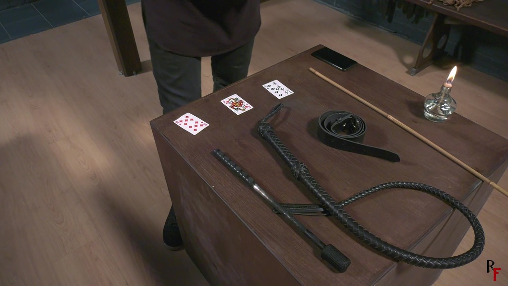 The clip begins with hogtied Alena lying on a bench, wearing just panties and socks. Masked man comes up to her, takes off her socks, and stuffs them into her mouth, wrapping them with tape over her head tightly. Then he explains the rules of the game and begins the pre-round, in which the device will be determined from which the action begins. According to the rules of the game, in each round, Alena will be whipped on her feet with a device from the ones proposed: a fire torch, a whip, a leather belt, and a bamboo stick.