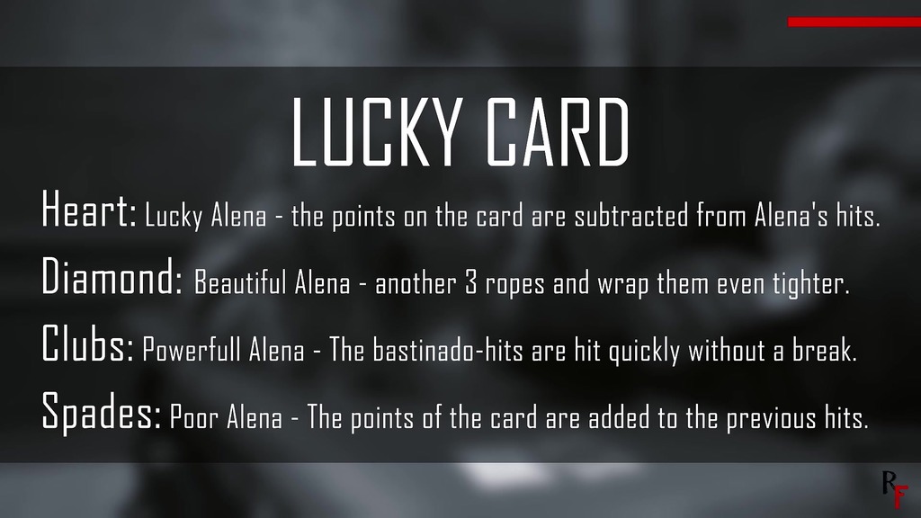 After cards in the pre-round determined the devices for all subsequent rounds, Masked again shuffled the deck in order to determine how many strokes (for the torch - seconds) she ll get, how strong they will be, and how they will be . For each round, two cards are assumed, the first determines the number of strokes depending on the color, suit, and value of the cards. Then he takes another card - it s a LUCKY CARD which is determined the punishment property for each round.