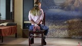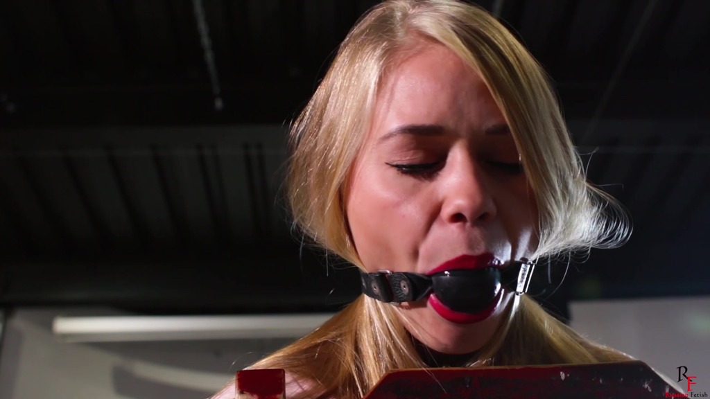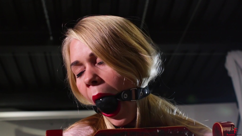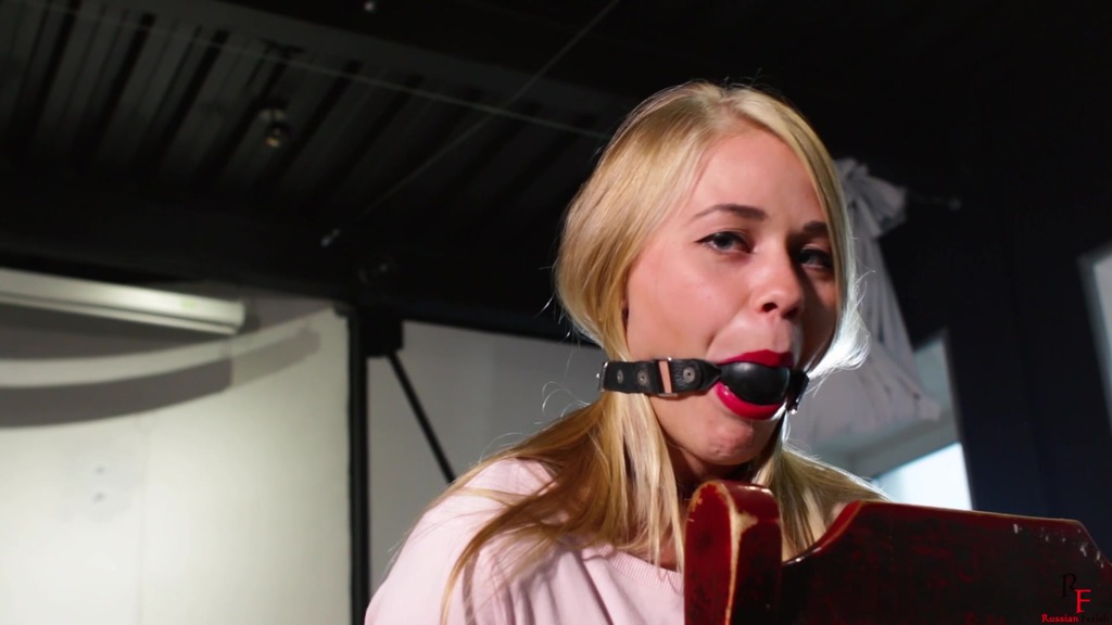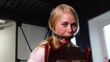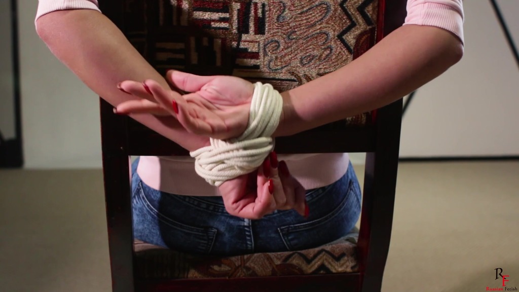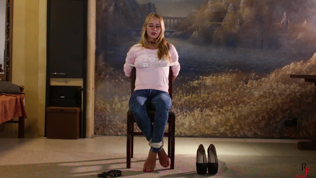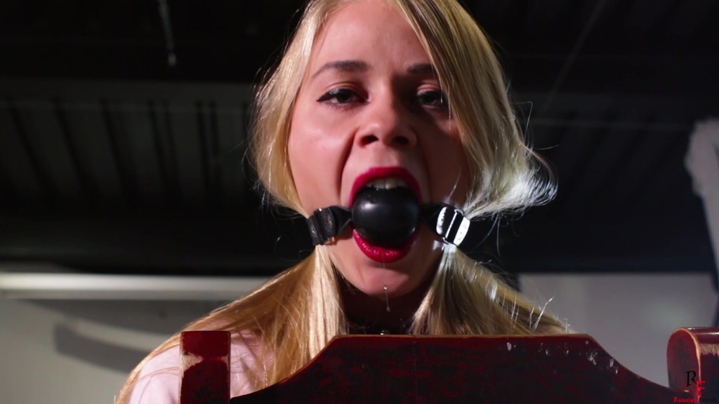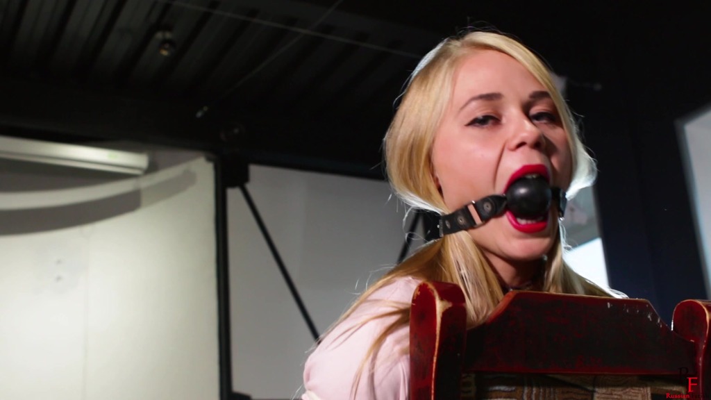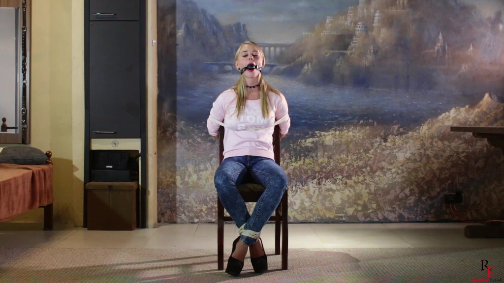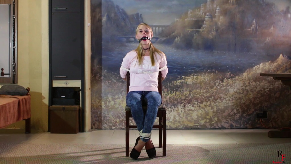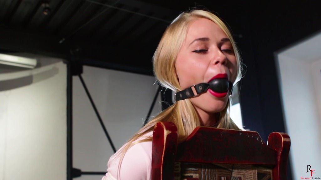 Darina sits opposite the chair. She has her wrists tied crossed behind her back, and the wrists are also tied to the waist. Her legs are tied and heels tied to the chair. Ball gag is in her mouth, she is absolutely helpless and watching the camera with lustful moans. She struggles sensually and it looks really hot. She s watching at