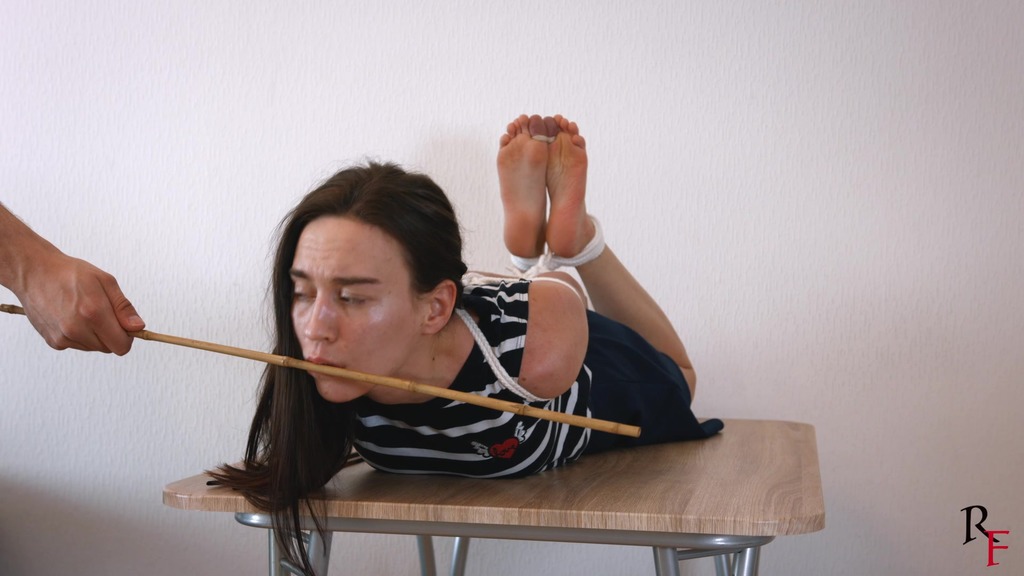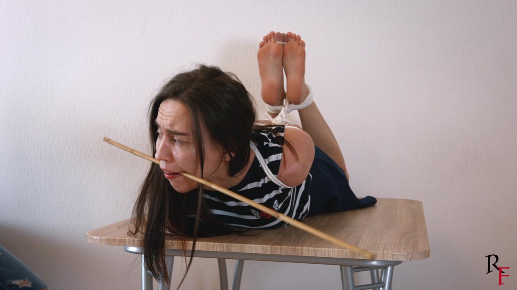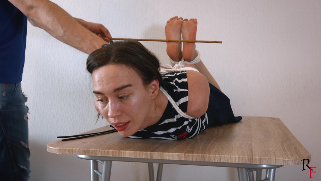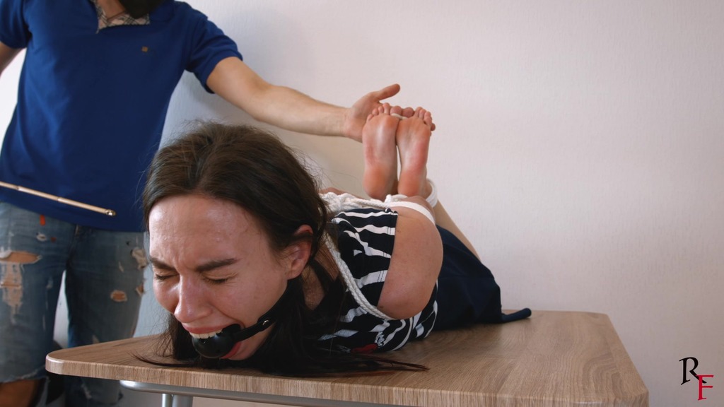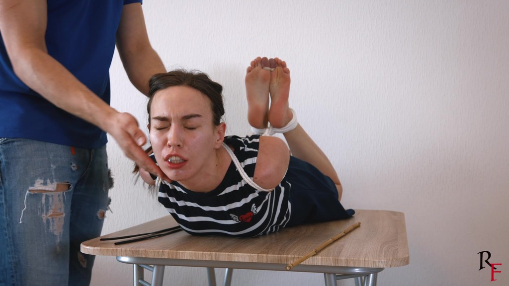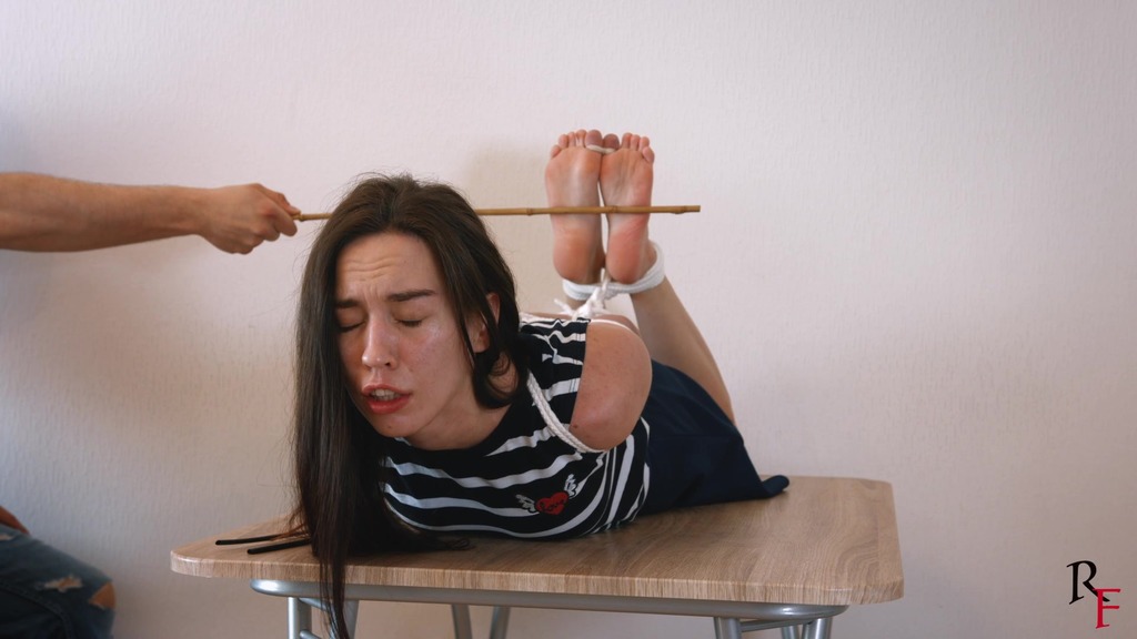 Little Home girl lies hogtied on the table. I come and put a bamboo stick into her mouth. Then I whip her cute feet with a rubber cord. This device isn’t very painful for her and I take the stick from her mouth and hit her feet. Then I put a ball gag into her mouth and continue the punishment. After that, we can see tiny red marks on her feet. Enjoy!