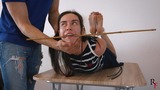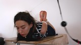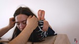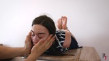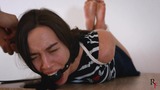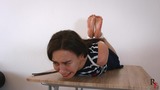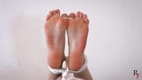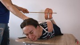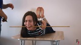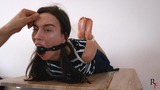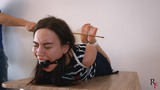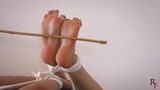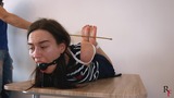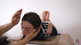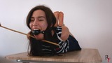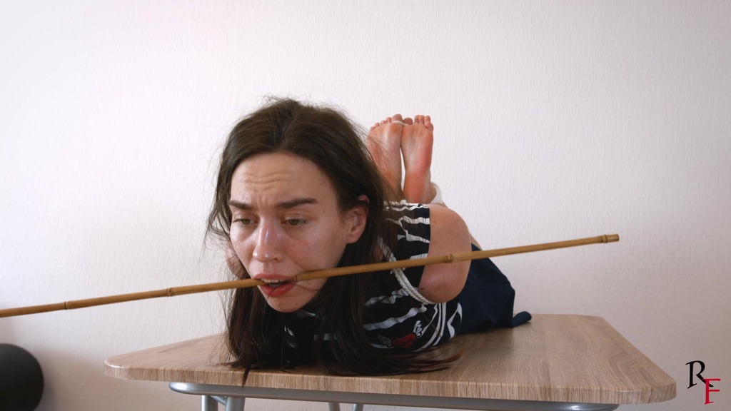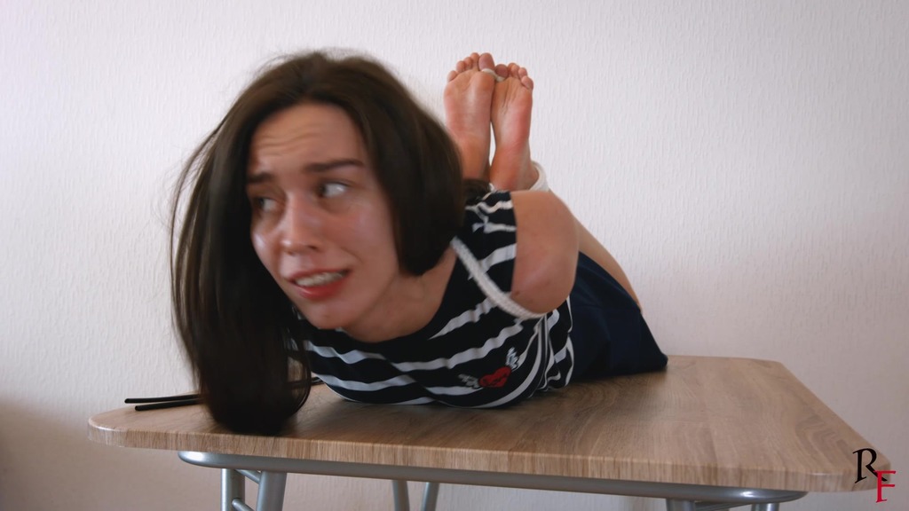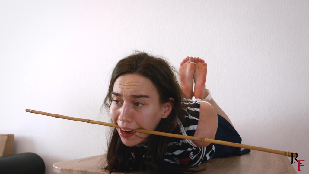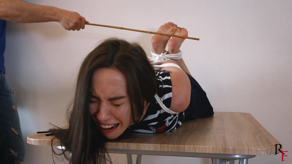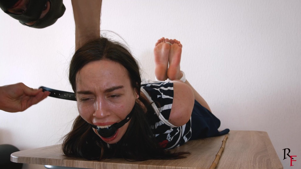 Little Home girl lies hogtied on the table. I come and put a bamboo stick into her mouth. Then I whip her cute feet with a rubber cord. This device isn’t very painful for her and I take the stick from her mouth and hit her feet. Then I put a ball gag into her mouth and continue the punishment. After that, we can see tiny red marks on her feet. Enjoy!