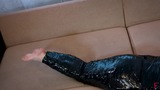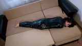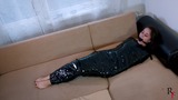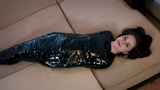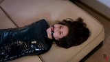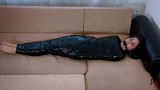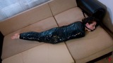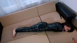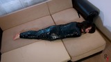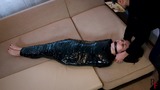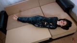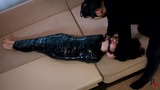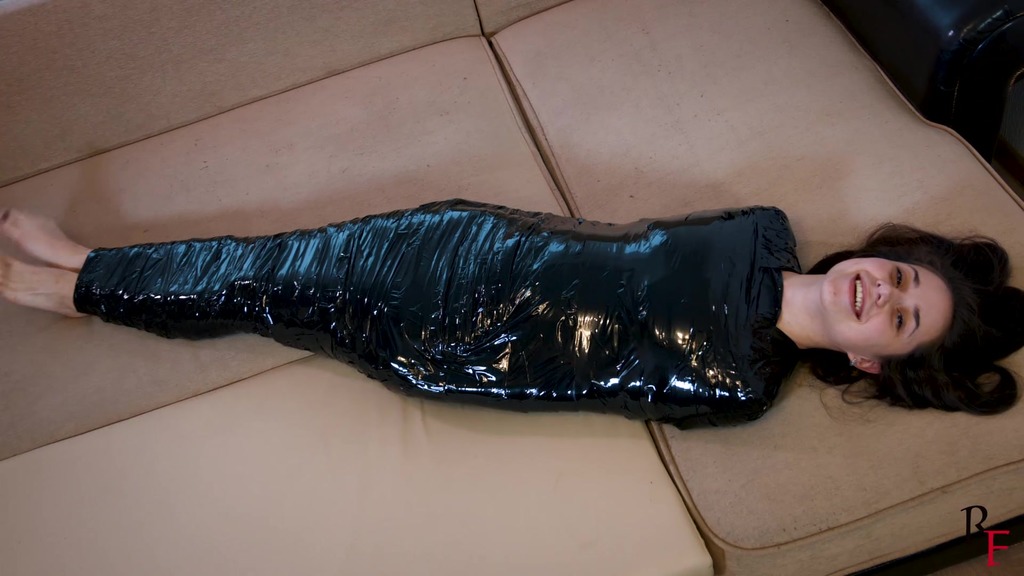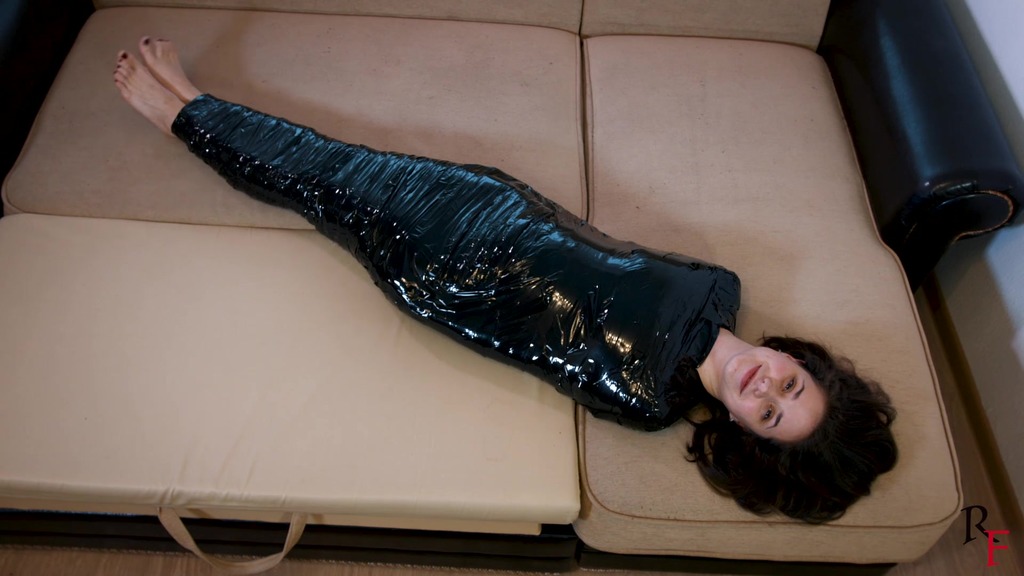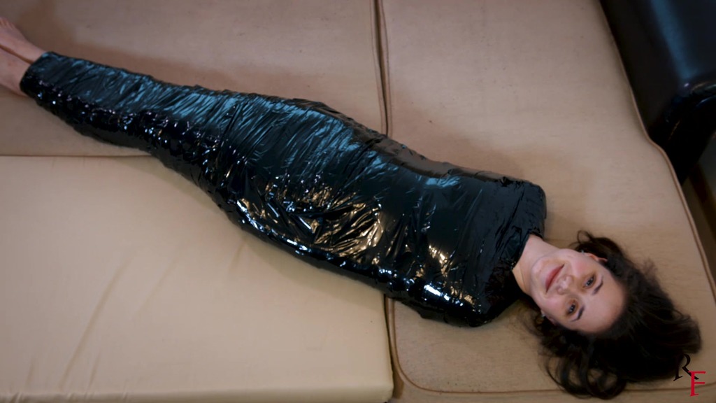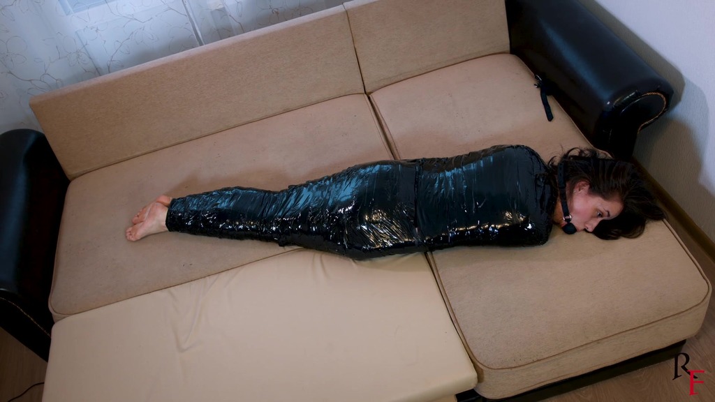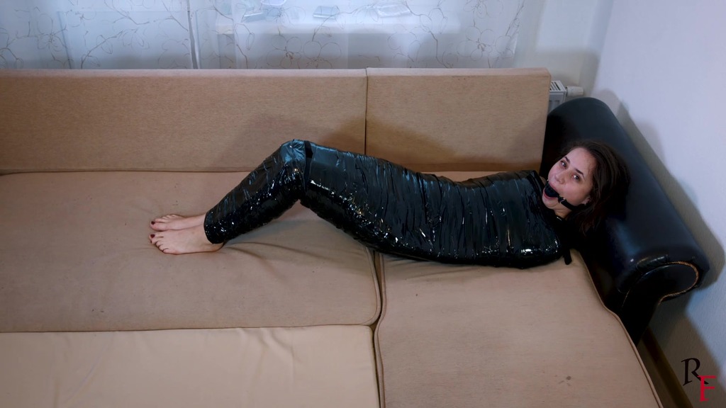 Tonya is mummified tightly with a tape from feet to neck. Her feet are open and naked, so we can enjoy them. At first, she s lying on the bed and then I put a ring gag in her mouth. She starts to play with her tongue which looks sexy.