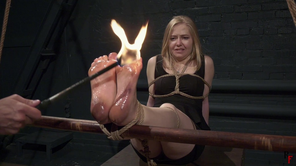 Olesya is in a classic bastinado position, her delightful bare feet are tied to the suspended bar with her soles forward. Olesya s big toes are tied. Her hands are tied behind her back, her body is wrapped with ropes.