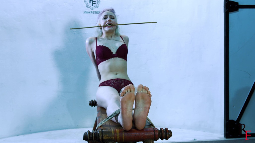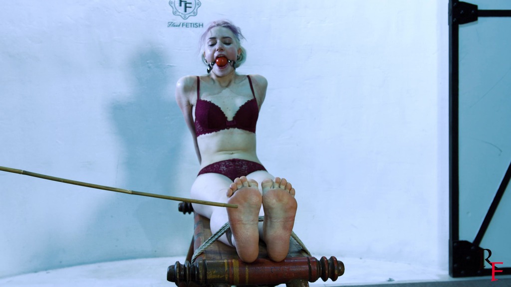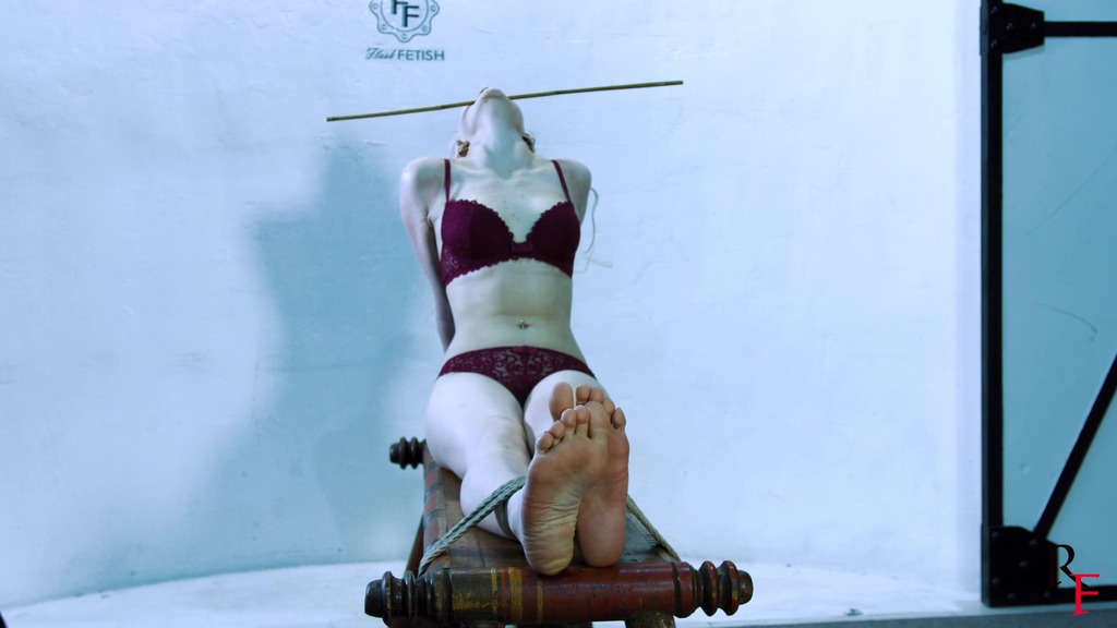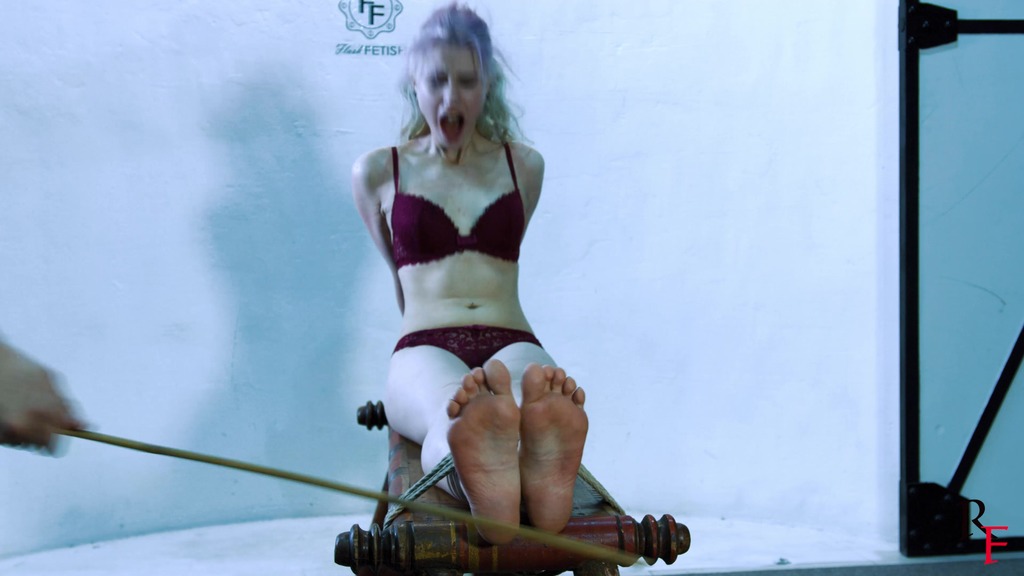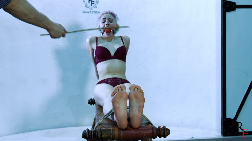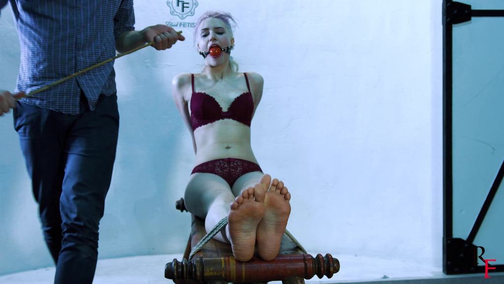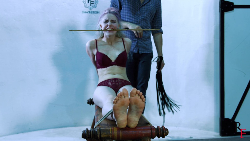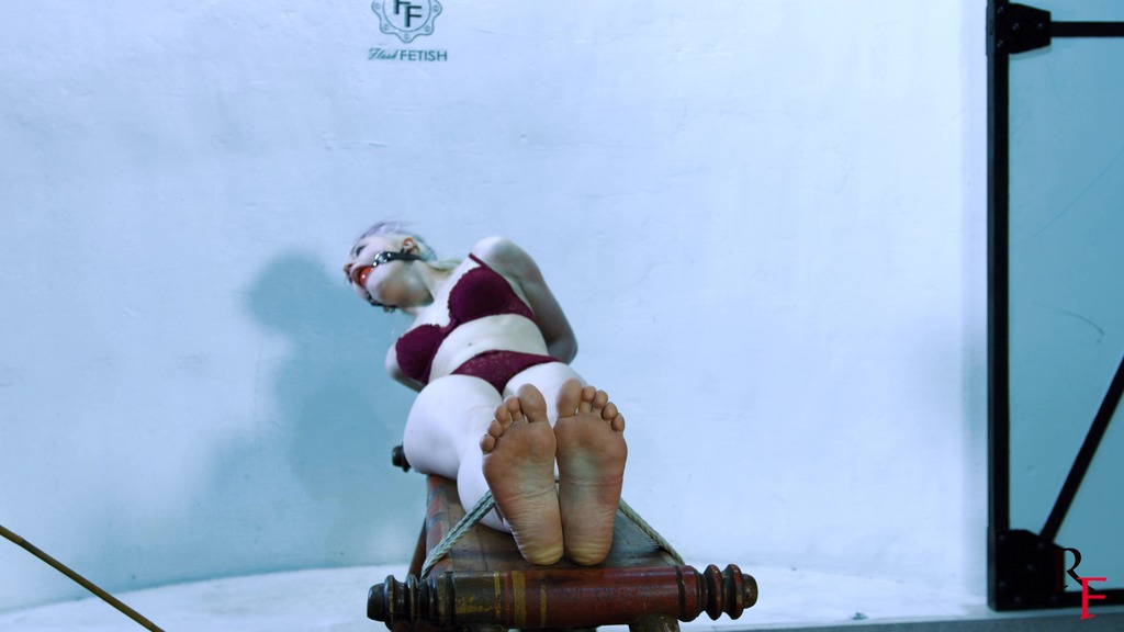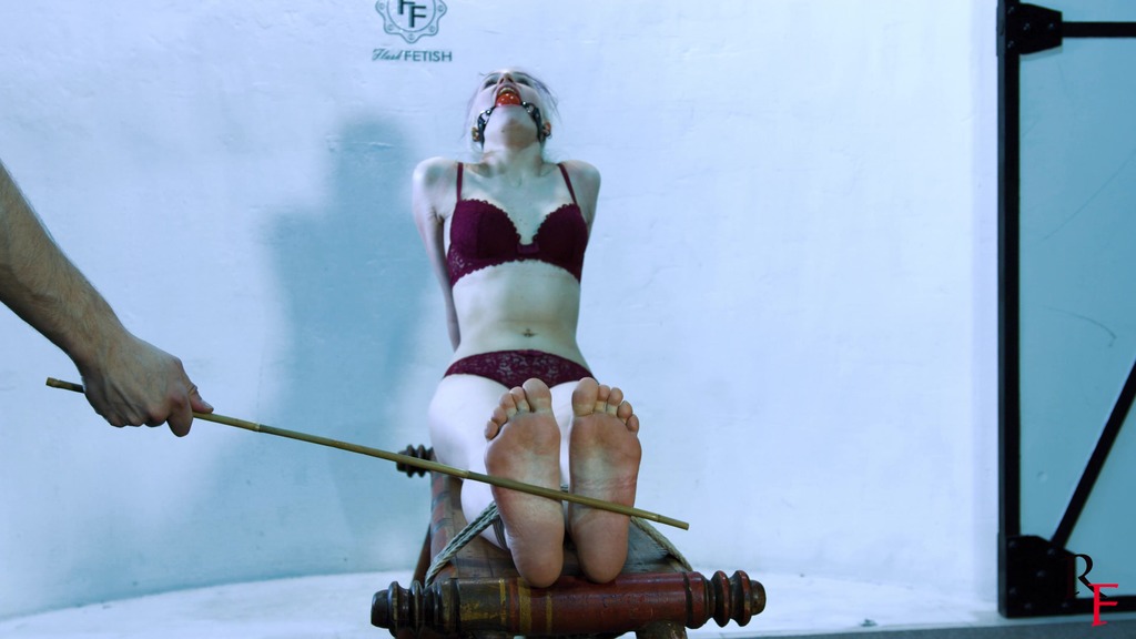Astrid in a sexy lingerie is tied on the bench. Her sexy big feet are waiting for punishment with a whip, paddle and bamboo stick. First I take a whip and hit her feet, harder and harder. Then I put a ball gag in her mouth and take the bamboo stick.