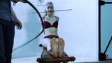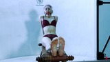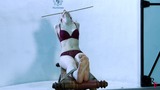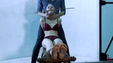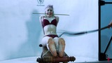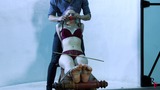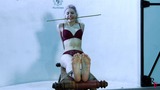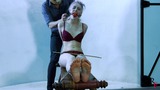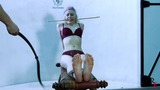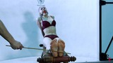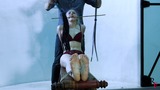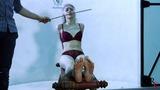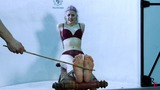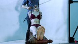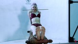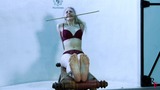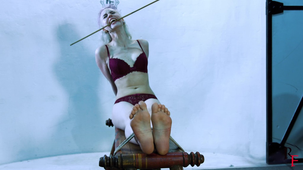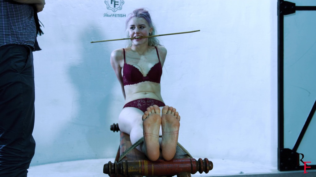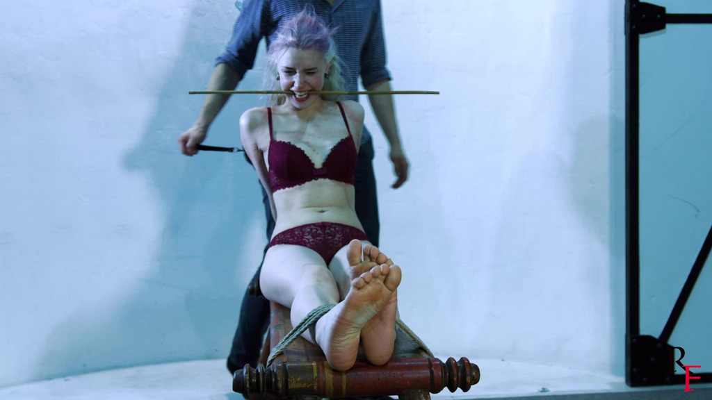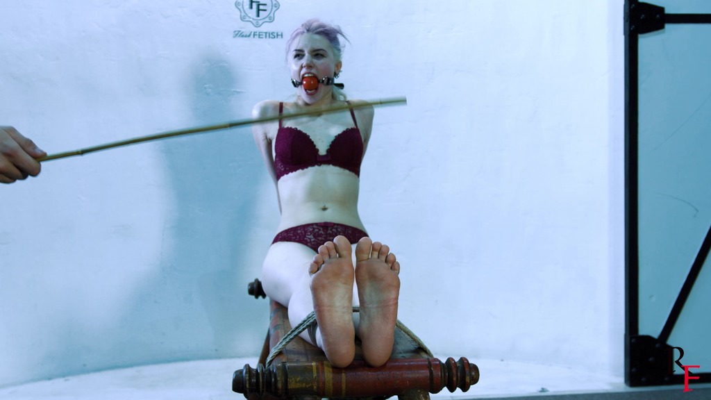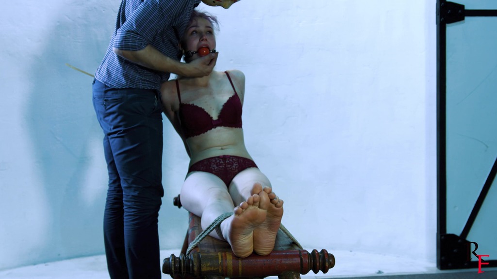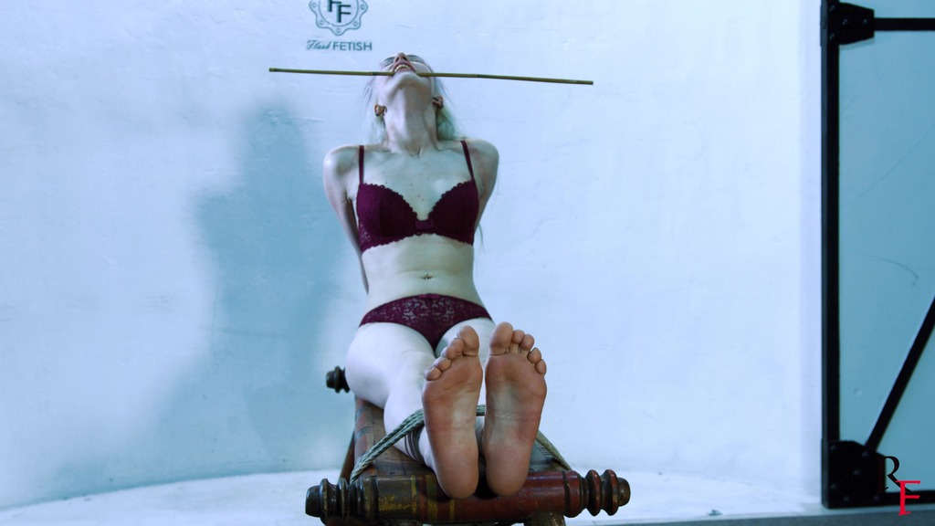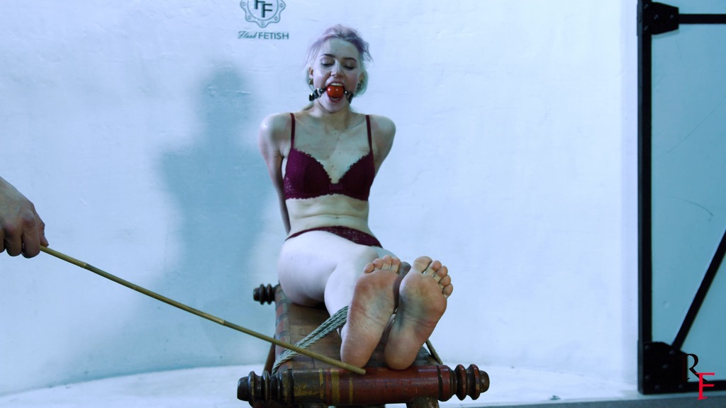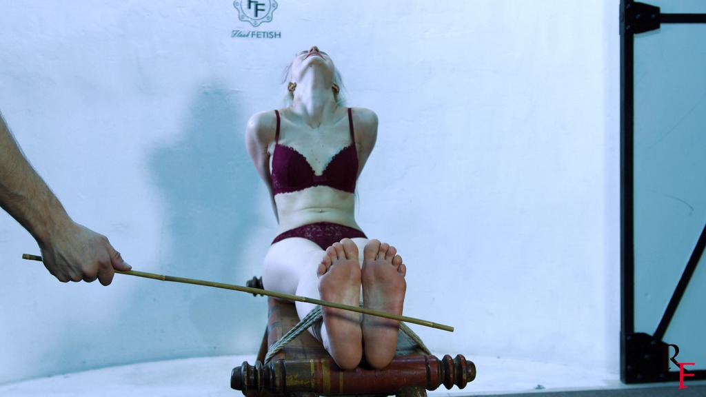 Astrid in a sexy lingerie is tied on the bench. Her sexy big feet are waiting for punishment with a whip, paddle and bamboo stick. First I take a whip and hit her feet, harder and harder. Then I put a ball gag in her mouth and take the bamboo stick.