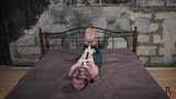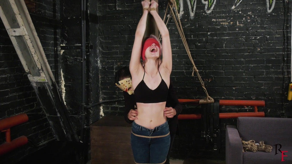2nd pose. Astrid is tied to a post, wearing the same clothes. Her eyes are blindfolded with a red bandage. One tickler carefully tickles her upper body, and another one shoots the process from different angles.