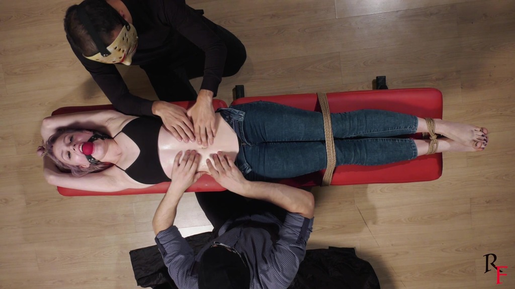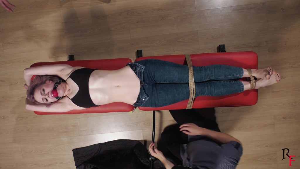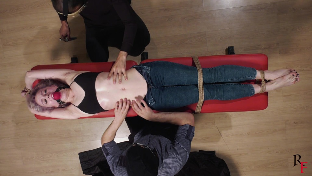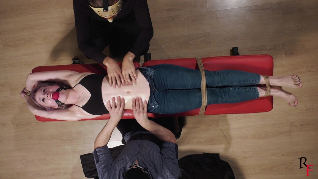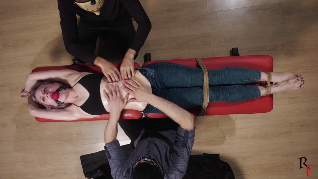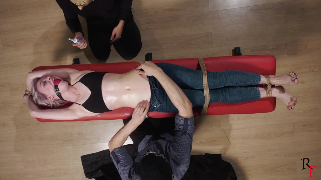 3rd pose. Astrid lies on a bench. Her arms and legs are stretched with ropes and tied, she has a big red ballgag between her teeth. Both ticklers continue having fun with her stomach, sides and armpits. They also apply some oil to her belly and navel, and use an electric toothbrush for more fun.