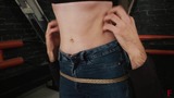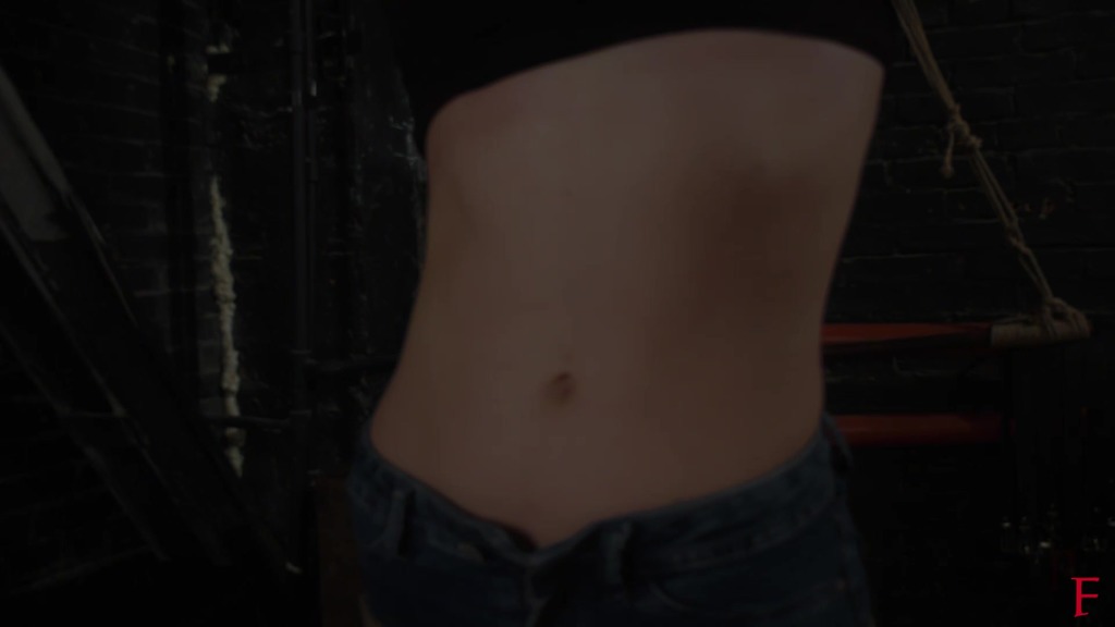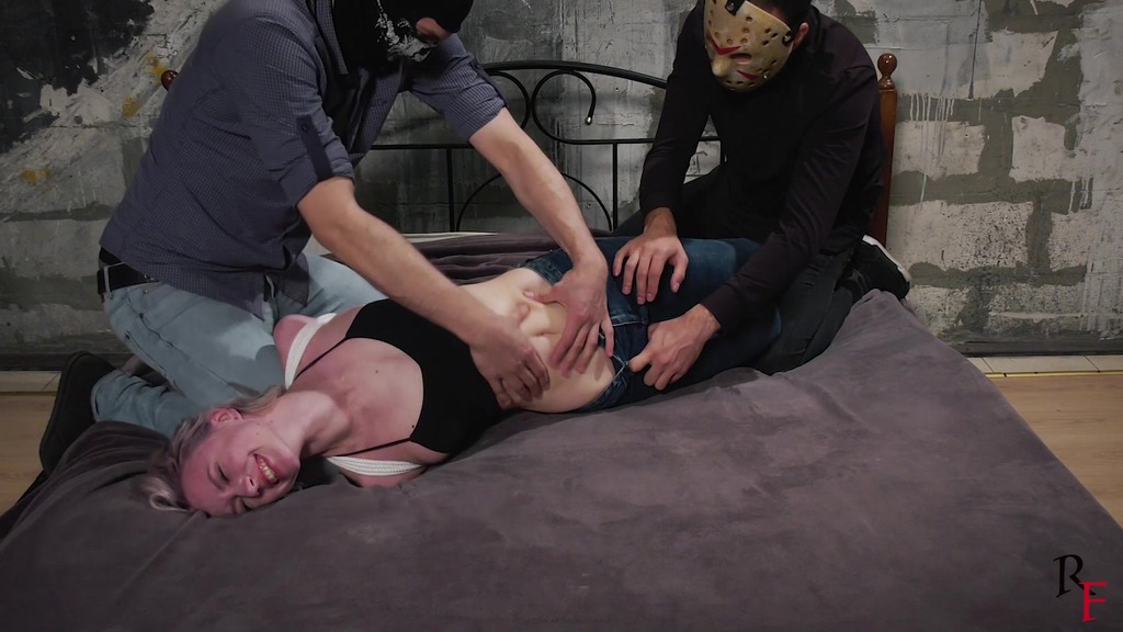 1st pose. Astrid is barefoot, in tight jeans and bra, lying and struggling on the bed, tied in hogtie. Two ticklers come up to her and begin to tickle her tummy for her. They roll her from side to side while one holds the ticklee and the other tickles her belly and sides.