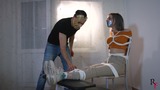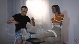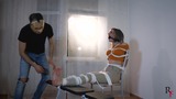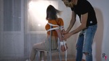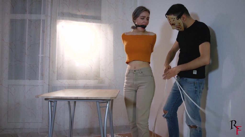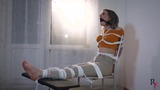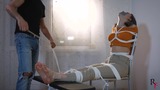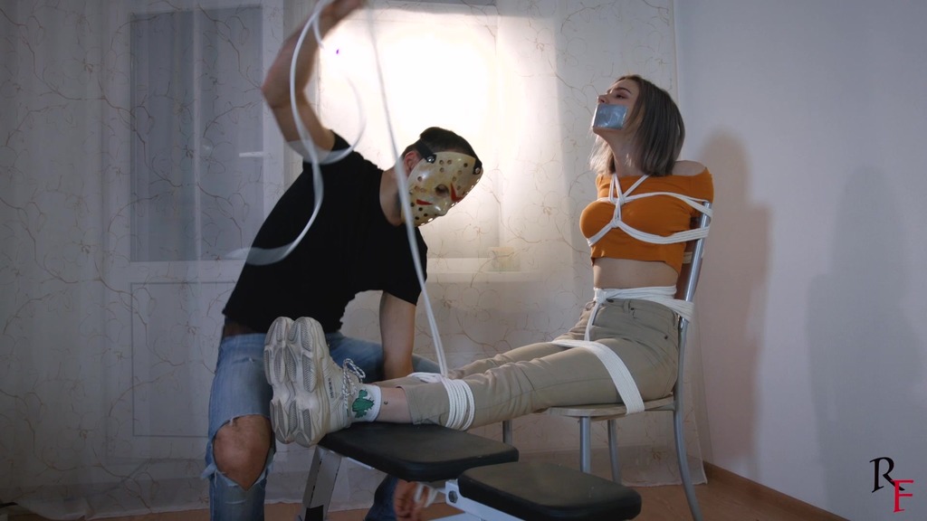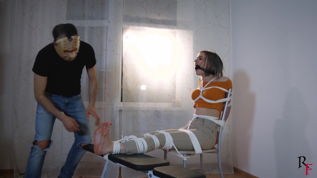 In the first scene, I drag Astrid into a room, put her in a chair and start tying with white ropes. I try to tie it as tightly as possible and use as many ropes as I can. First, I tie her wrists and elbows, then make a strong crotch rope. Then I put the bench next to her and tie her legs to the bench. Then I took off her sneakers and socks from her feet, change a tape on a big ball gag. I tickle her feet just a little bit and then tie her big toes together with a string. After that, I go and leave the babe alone to sit like this. Astrid moans, groans and struggles, but can t do anything.