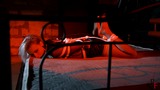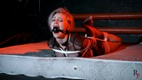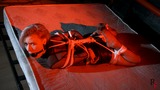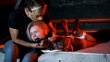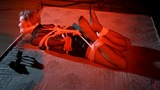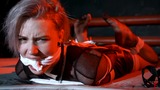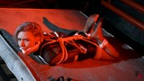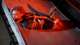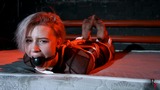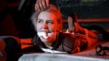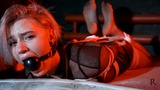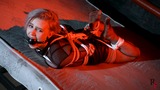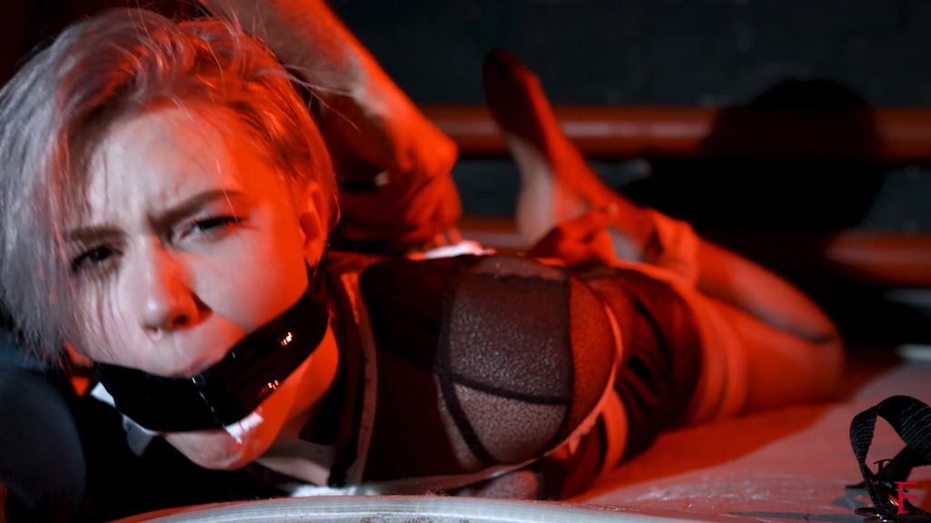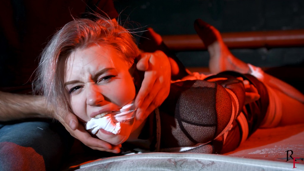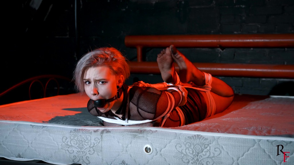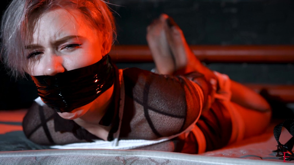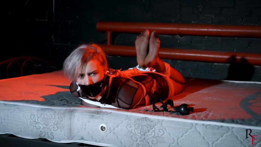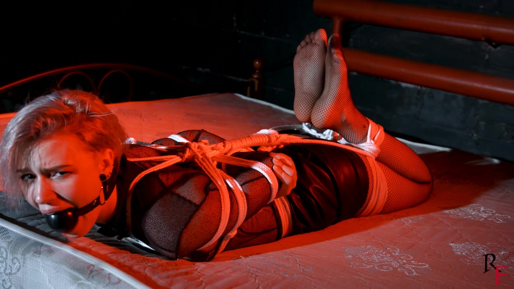 This is the second part, now Astrid is frogtied tightly on the bed. She’s without her shoes now and you can see her feet in nice black pantyhose. Astrid looks at the camera and struggles as much as ropes allow it. I come and put a hugest ball gag we have. Among all our models only Astrid can take such a big ball gag. Then I leave her alone.