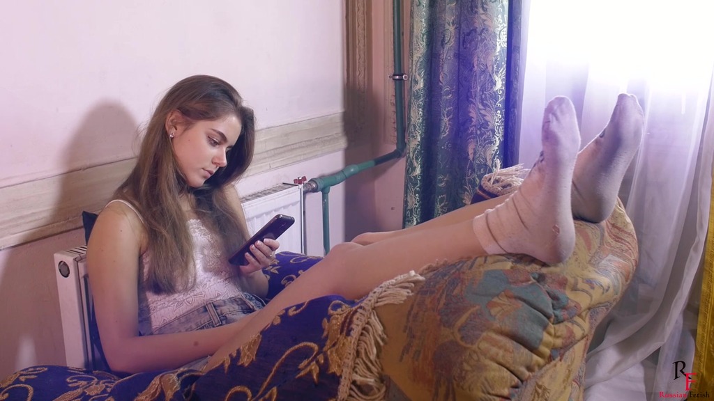 At the beginning of the clip, Leya rests on a chair and lets us enjoy her sexy feet in white socks. She s chatting with friends. At some point, she takes off her socks and shows her sexy bare feet on the camera. He squeezes them, moves her toes and wrinkles the skin on the soles. Leya likes this kind of attention and she smiles nicely.