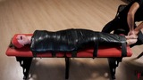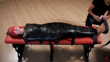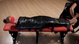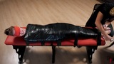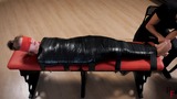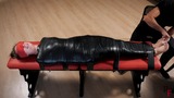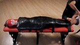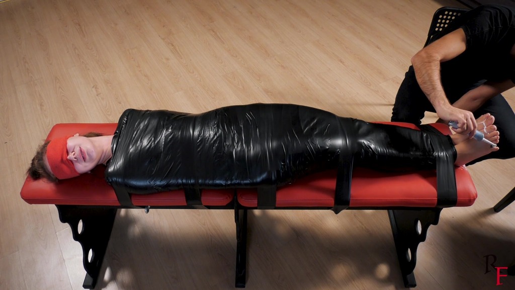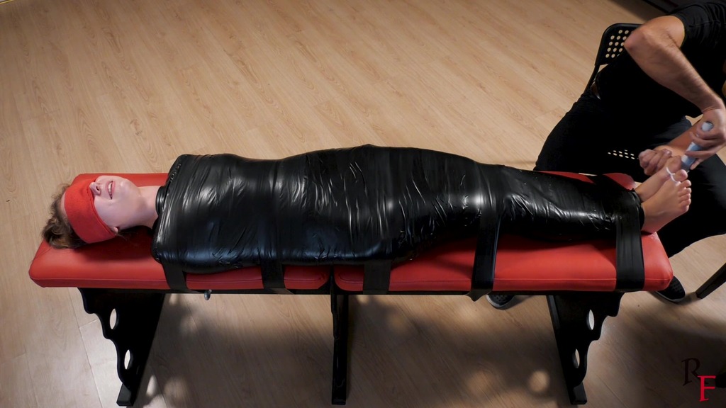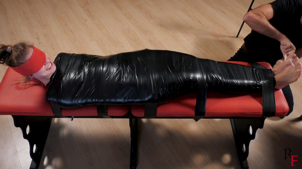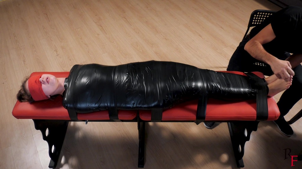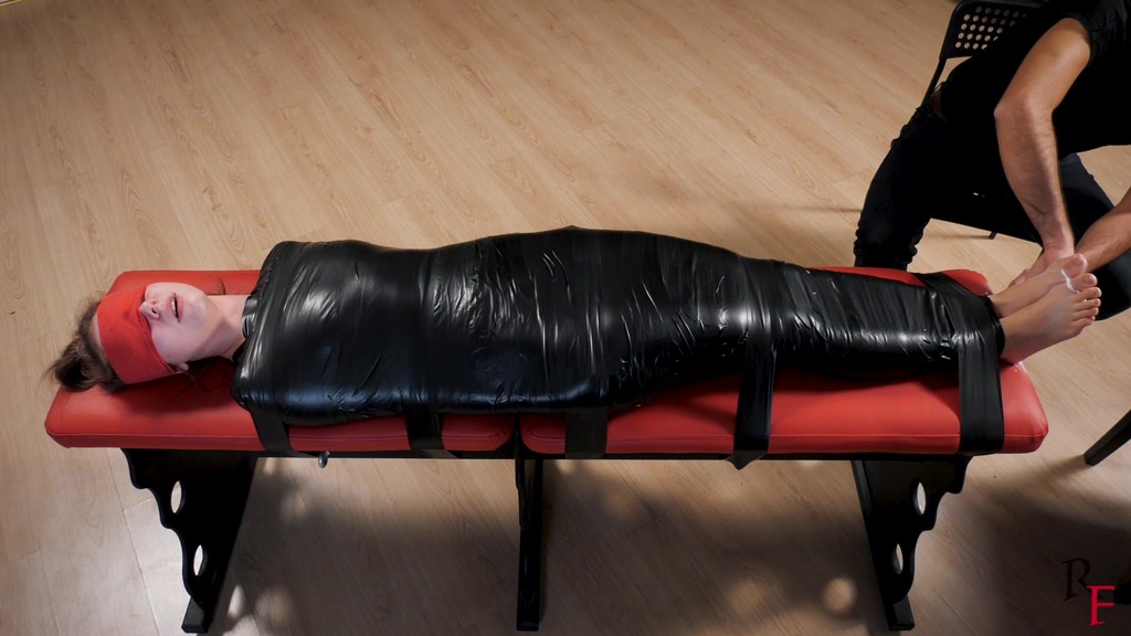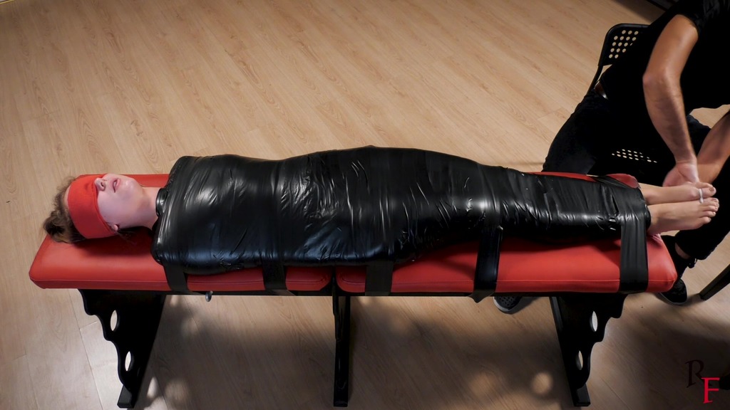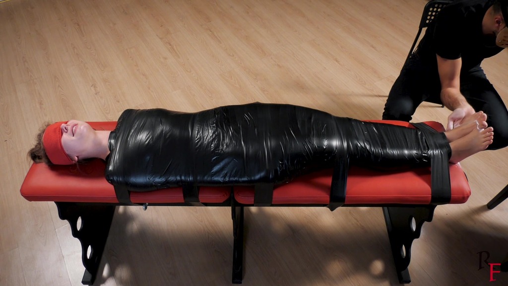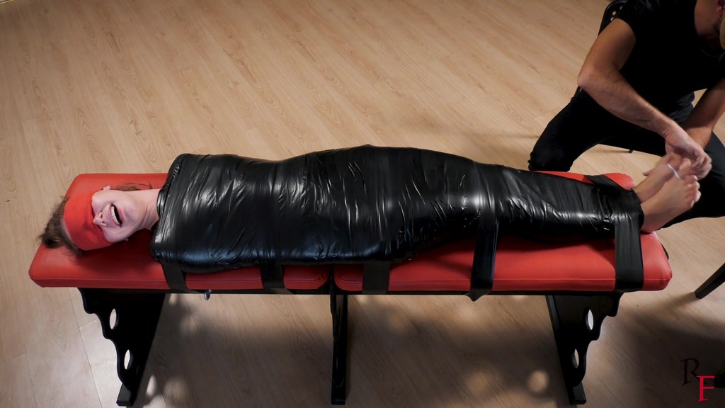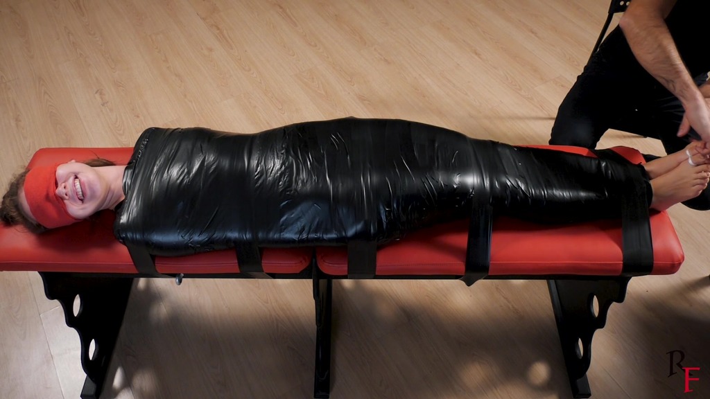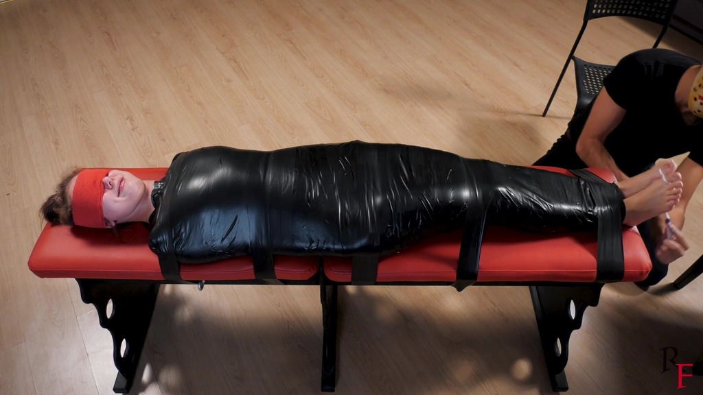 In this video, Leya had to sweat properly, both literally and figuratively. Before I describe what is happening in the video, I want to say a few words about the cocoon in which Leya is wrapped. So, in the beginning, we wrapped her in several layers of a regular transparent film so that the PVC tape doesn t stick to her skin, because otherwise removing the tape from the bare skin would be the worst day of her life. And so, two layers of regular tape and tight PVC tape over them.