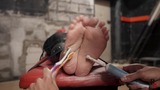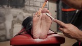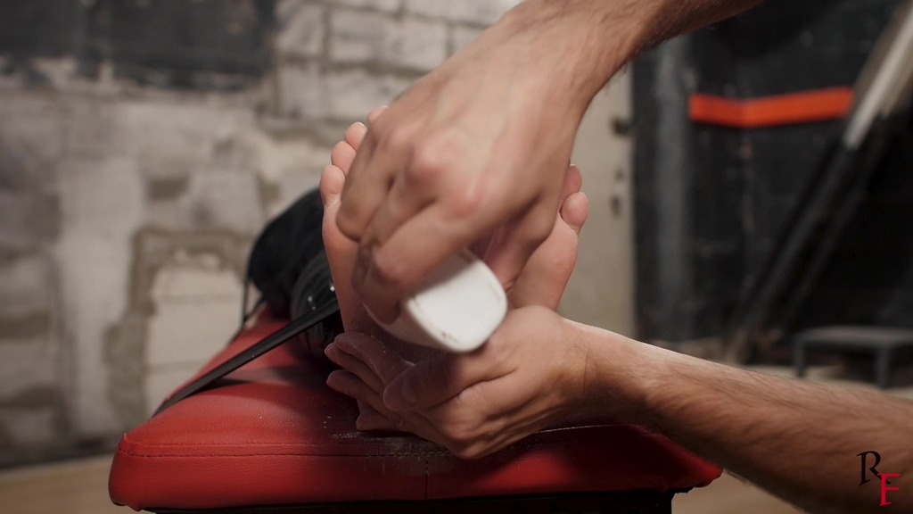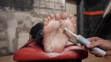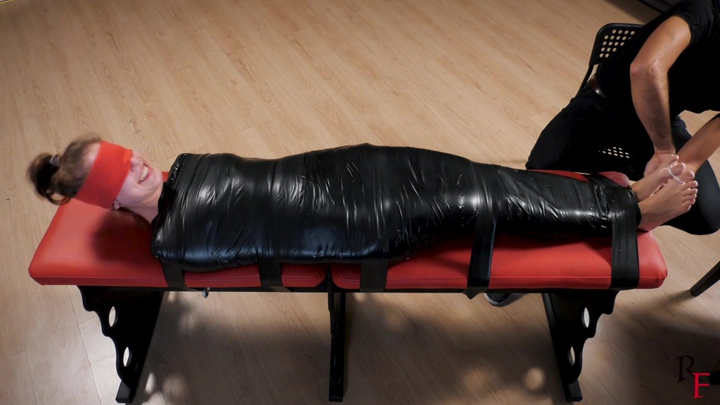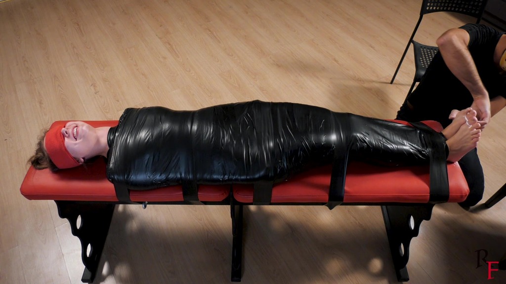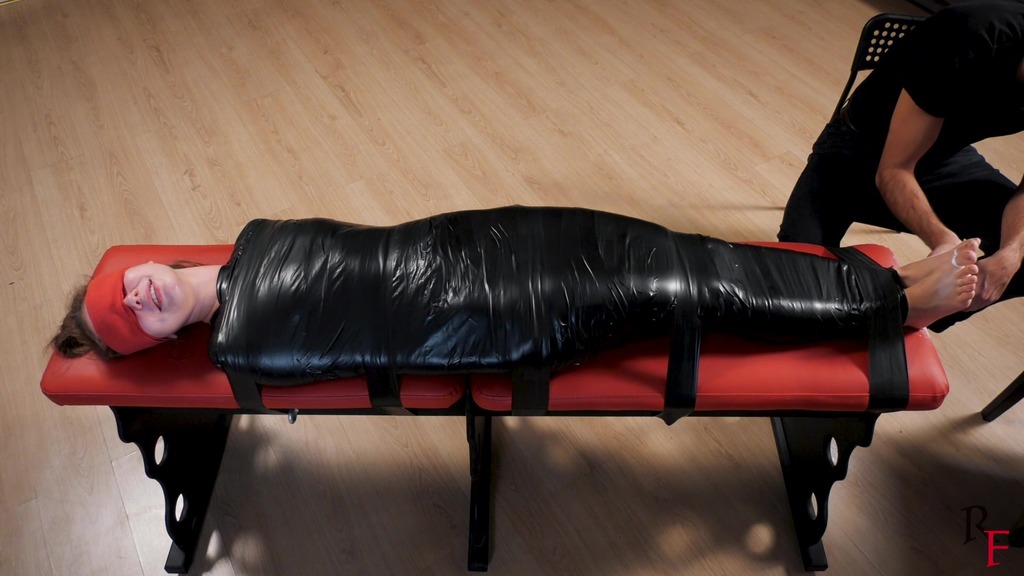 In the first scene, the mummified Leya lies on her back, her eyes blindfolded with a red bandage. Her feet are open, her toes are tied and I tickle her feet with the help of various devices: with my hands, ordinary hairbrushes, and electric toothbrushes. In this scene, I poured her feet with a powder to add new sensations to her. Leya screeches laughing and swearing.